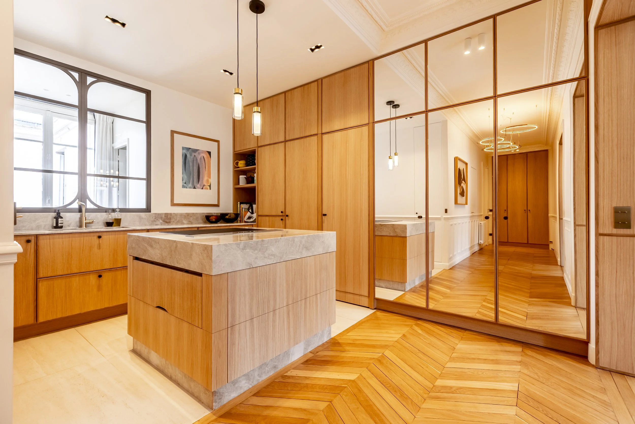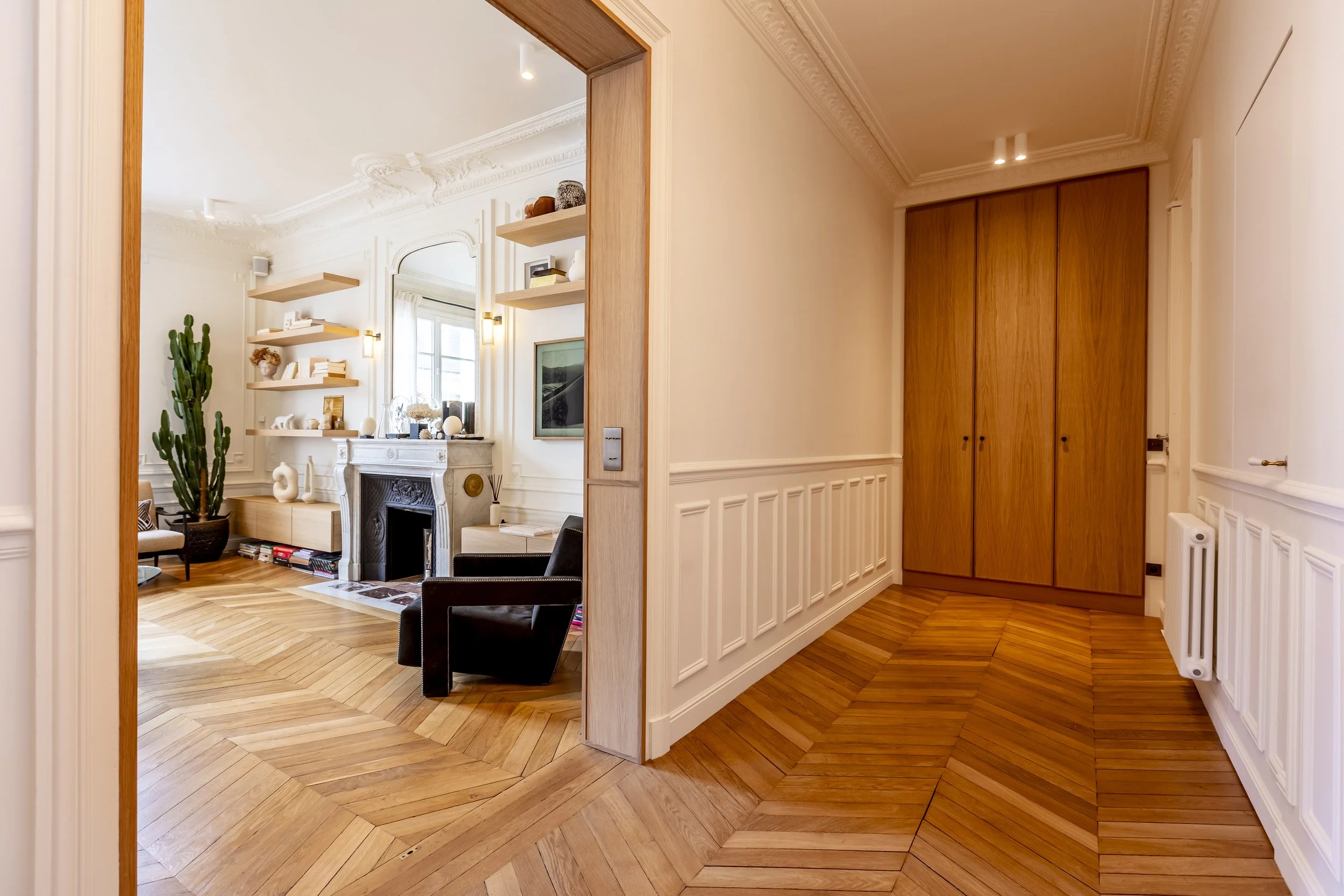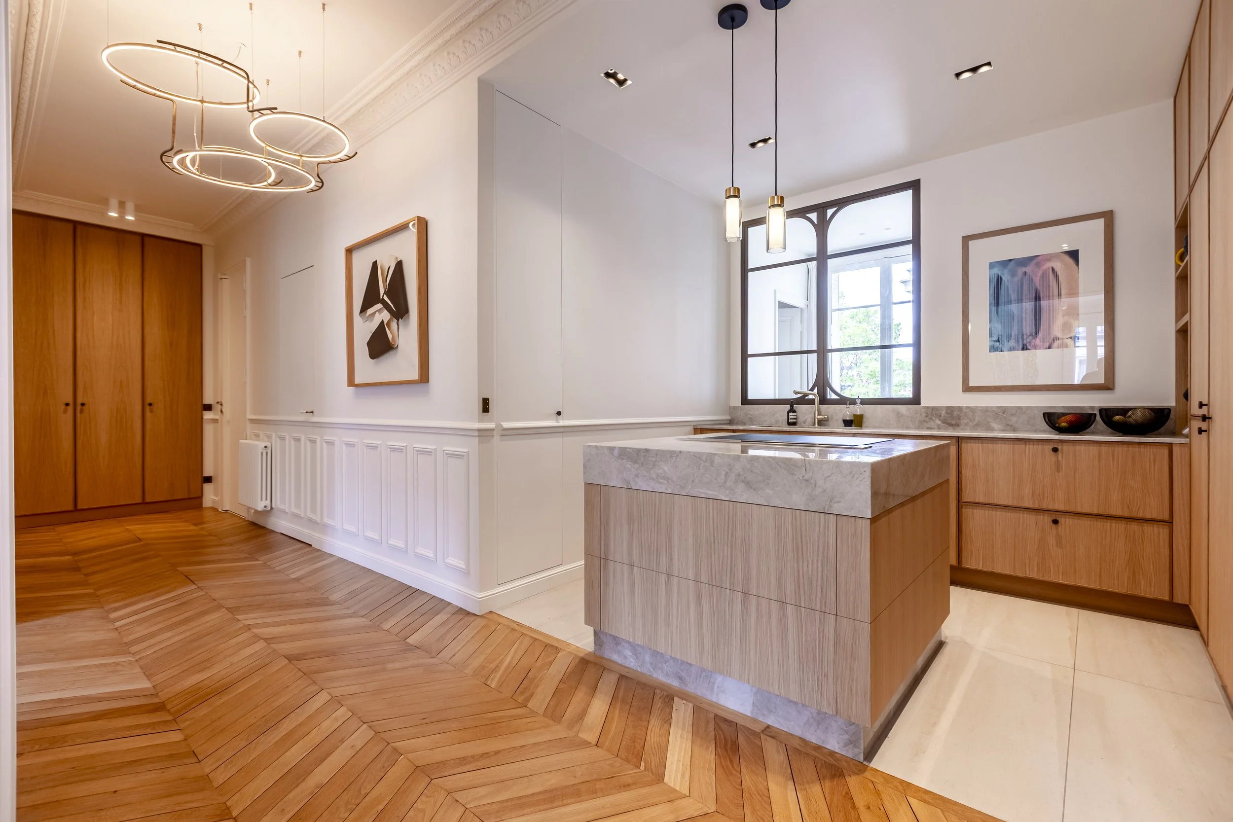 Situé à Neuilly-sur-Seine, cet appartement haussmannien entièrement rénové conjugue l'élégance classique du bâti — moulures, parquet en point de Hongrie, volumes généreux — à une architecture intérieure contemporaine et épurée. Menuiseries sur mesure en bois, pierre et terrazzo composent un intérieur où chaque matériau est choisi pour sa noblesse et sa cohérence d'ensemble.