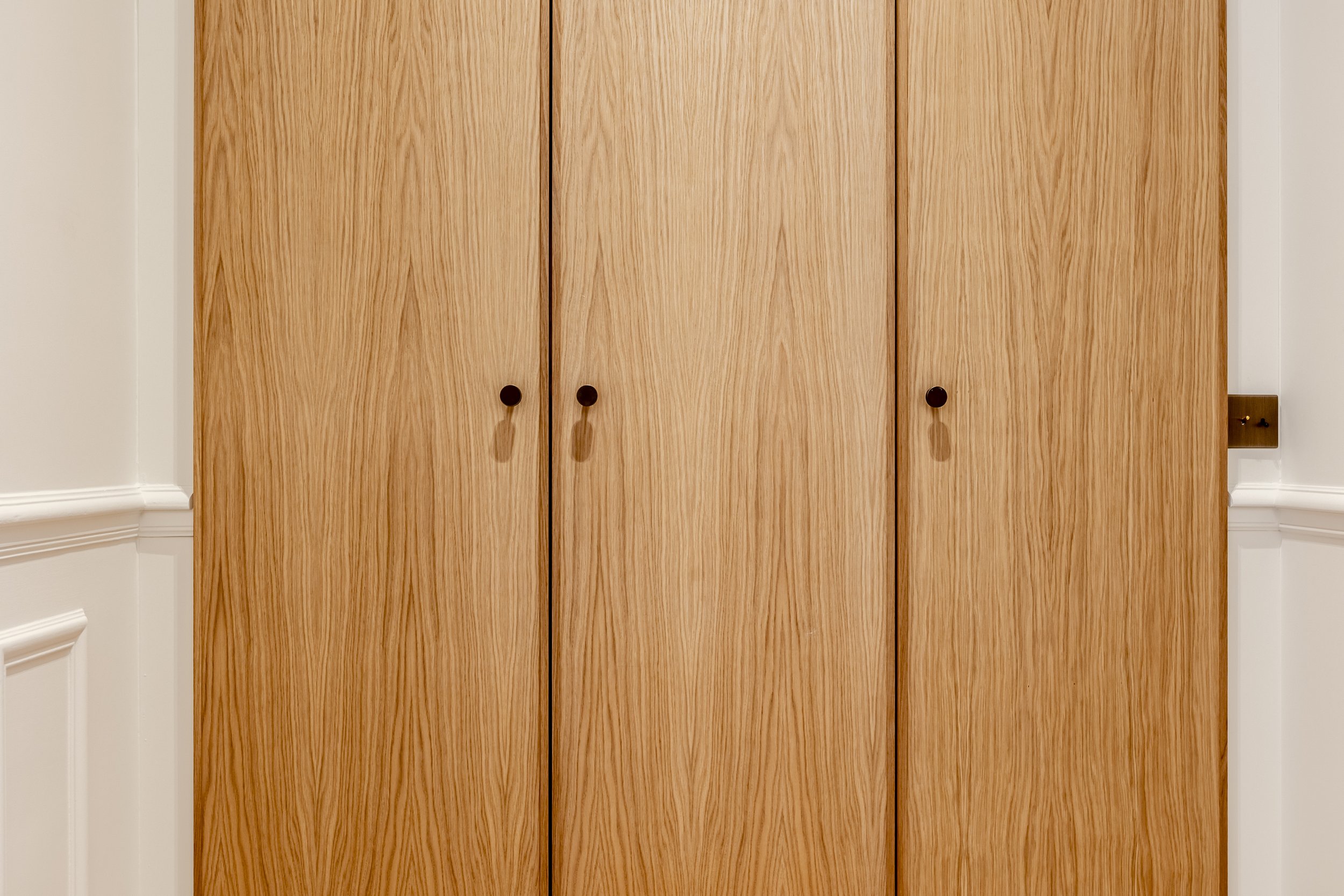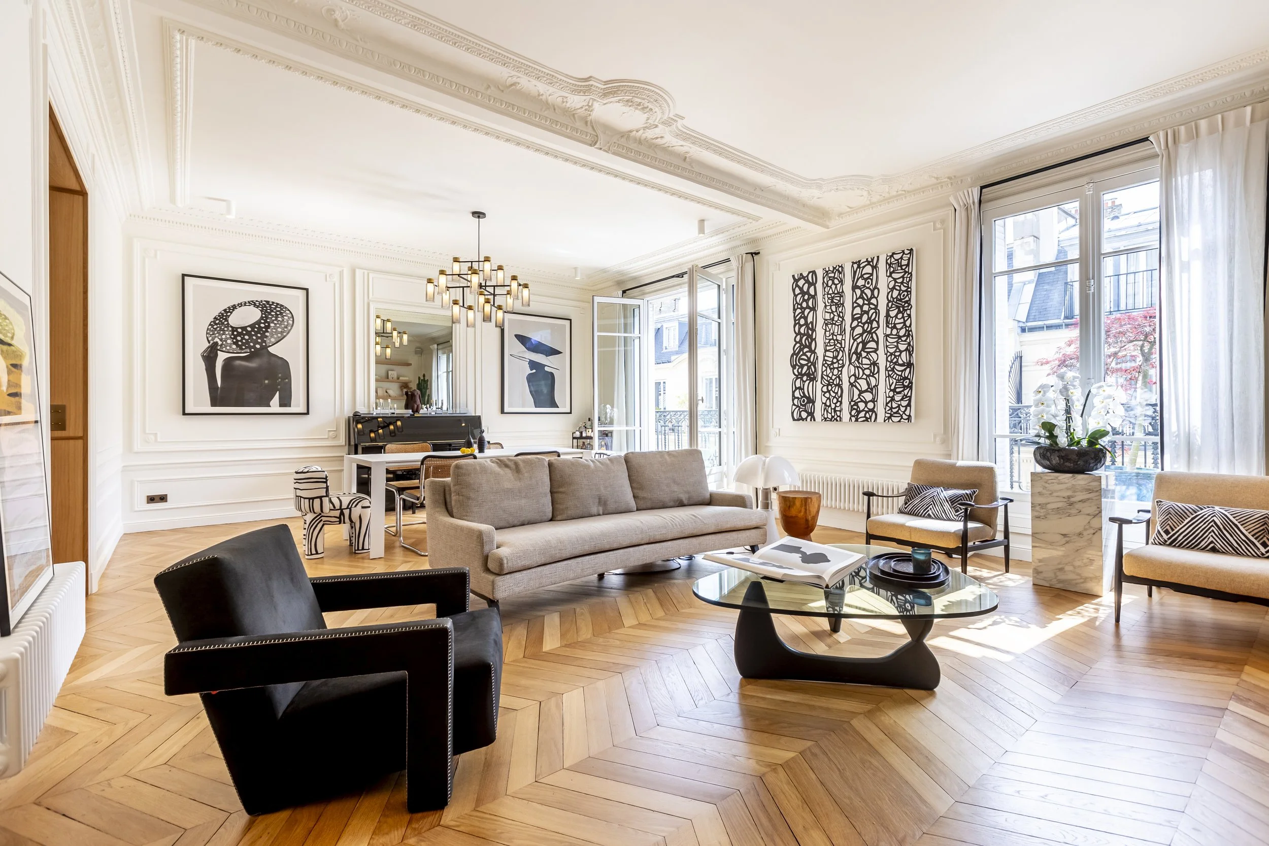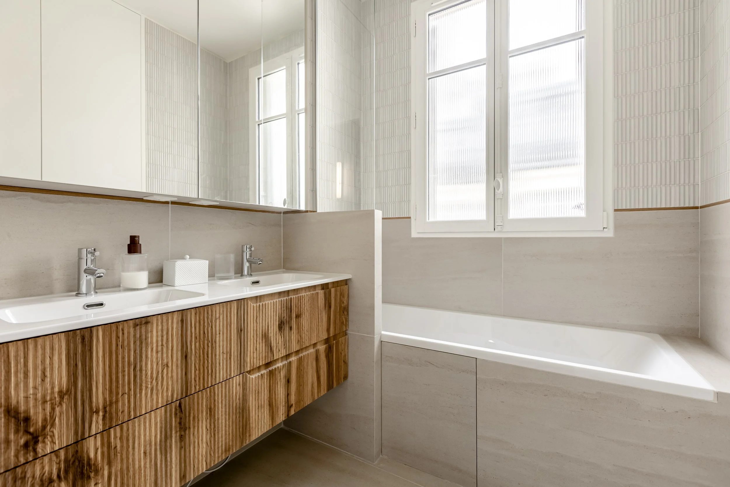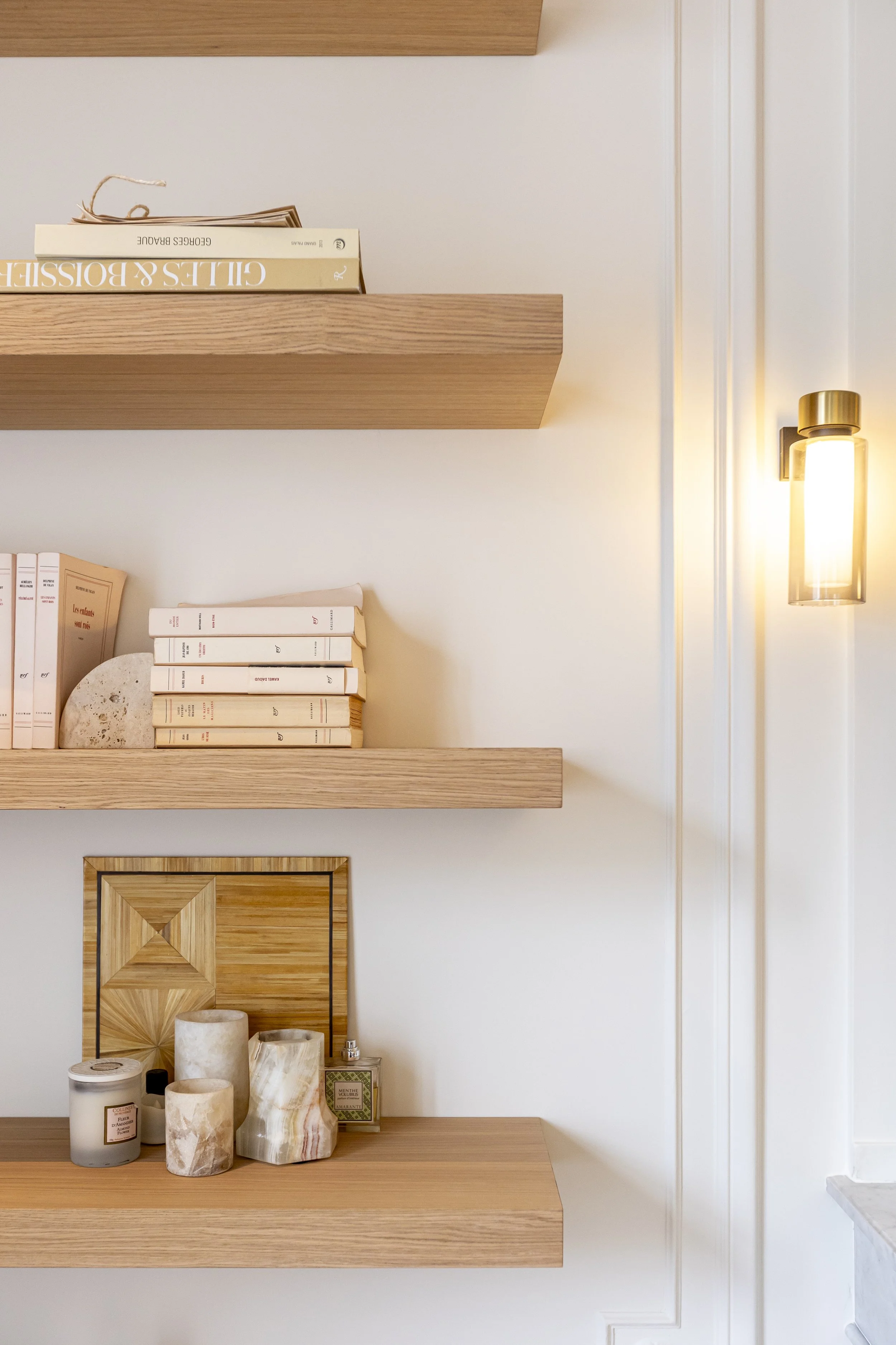 Situé à Neuilly-sur-Seine, cet appartement haussmannien entièrement rénové conjugue l'élégance classique du bâti — moulures, parquet en point de Hongrie, volumes généreux — à une architecture intérieure contemporaine et épurée. Menuiseries sur mesure en bois, pierre et terrazzo composent un intérieur où chaque matériau est choisi pour sa noblesse et sa cohérence d'ensemble.