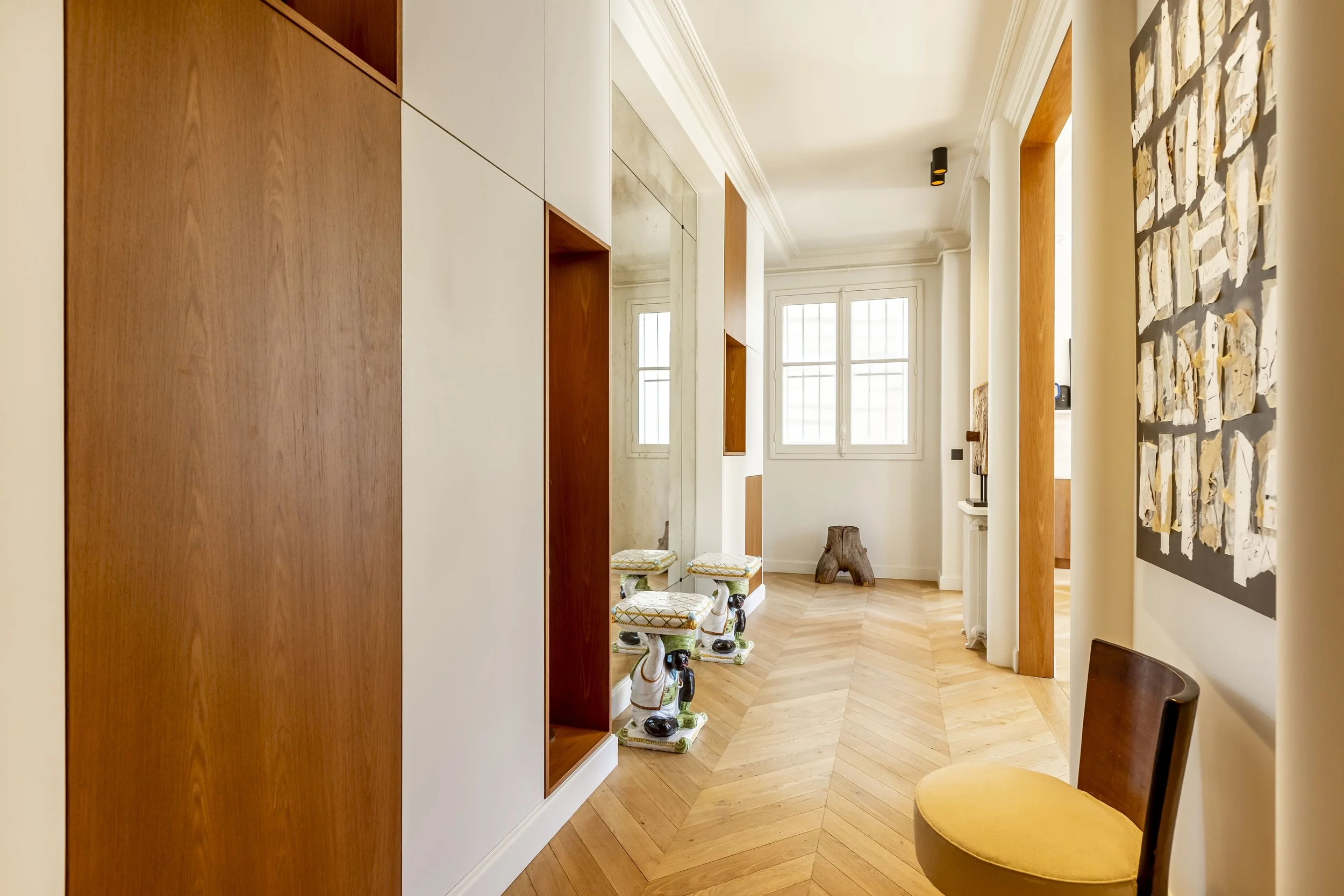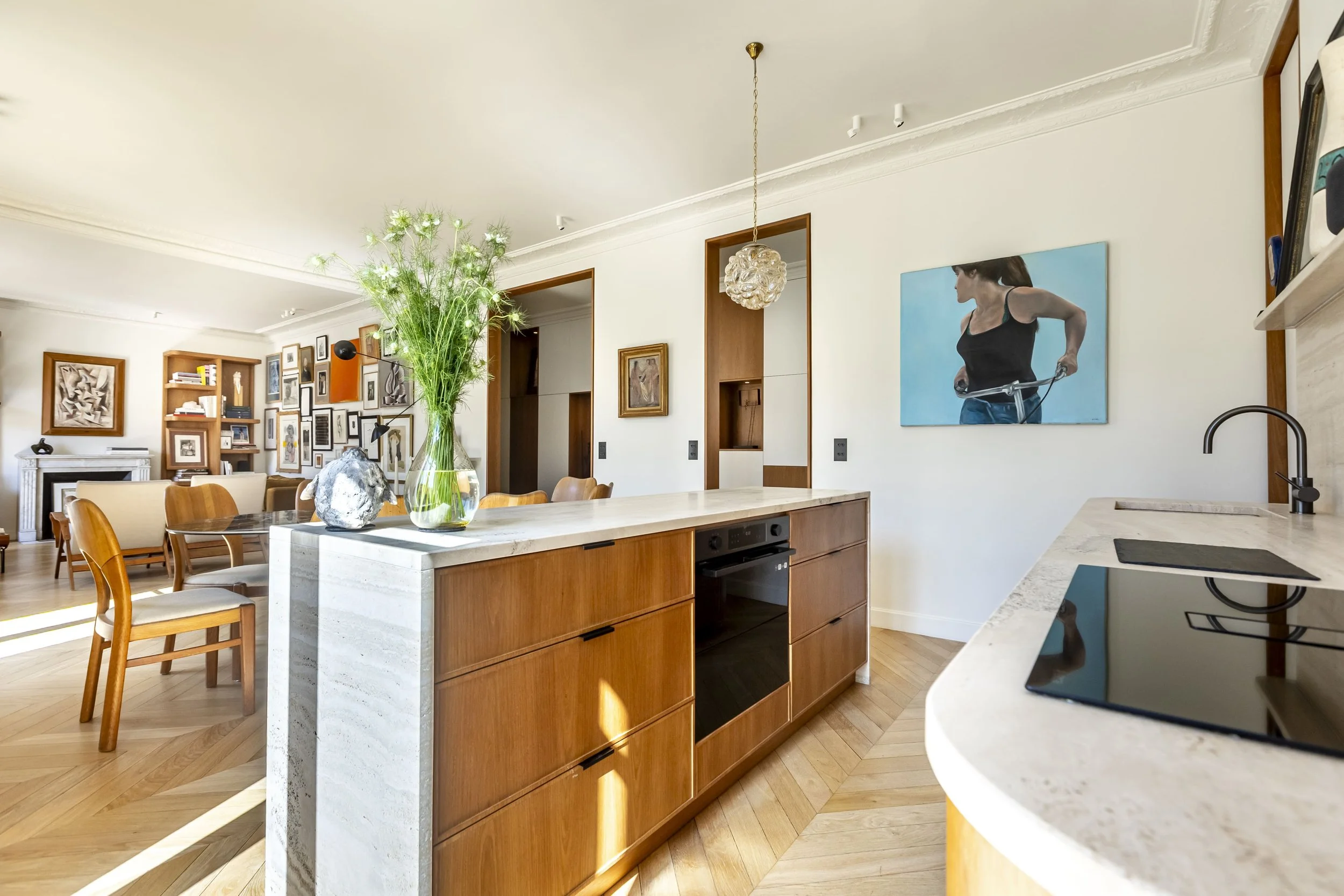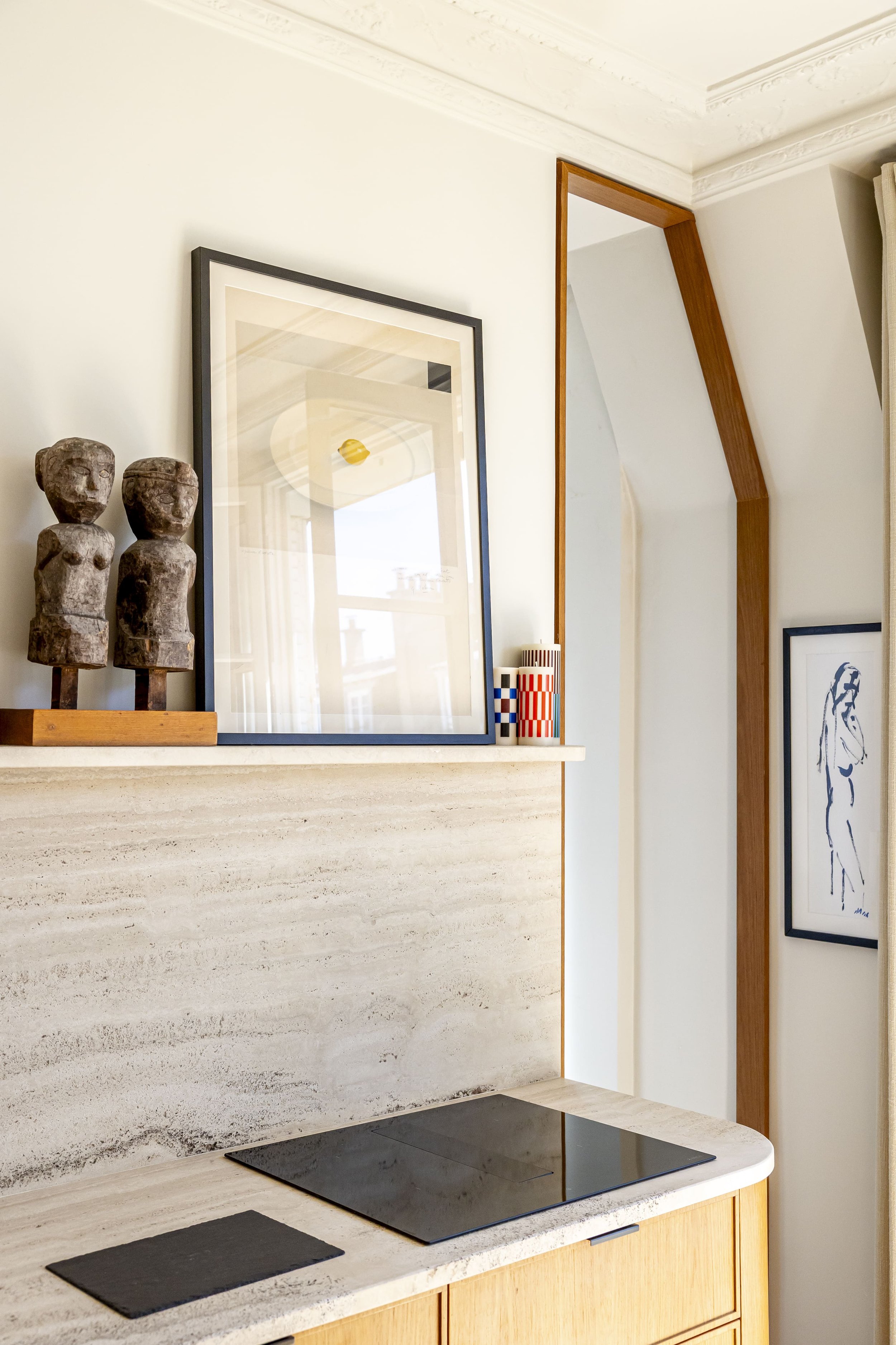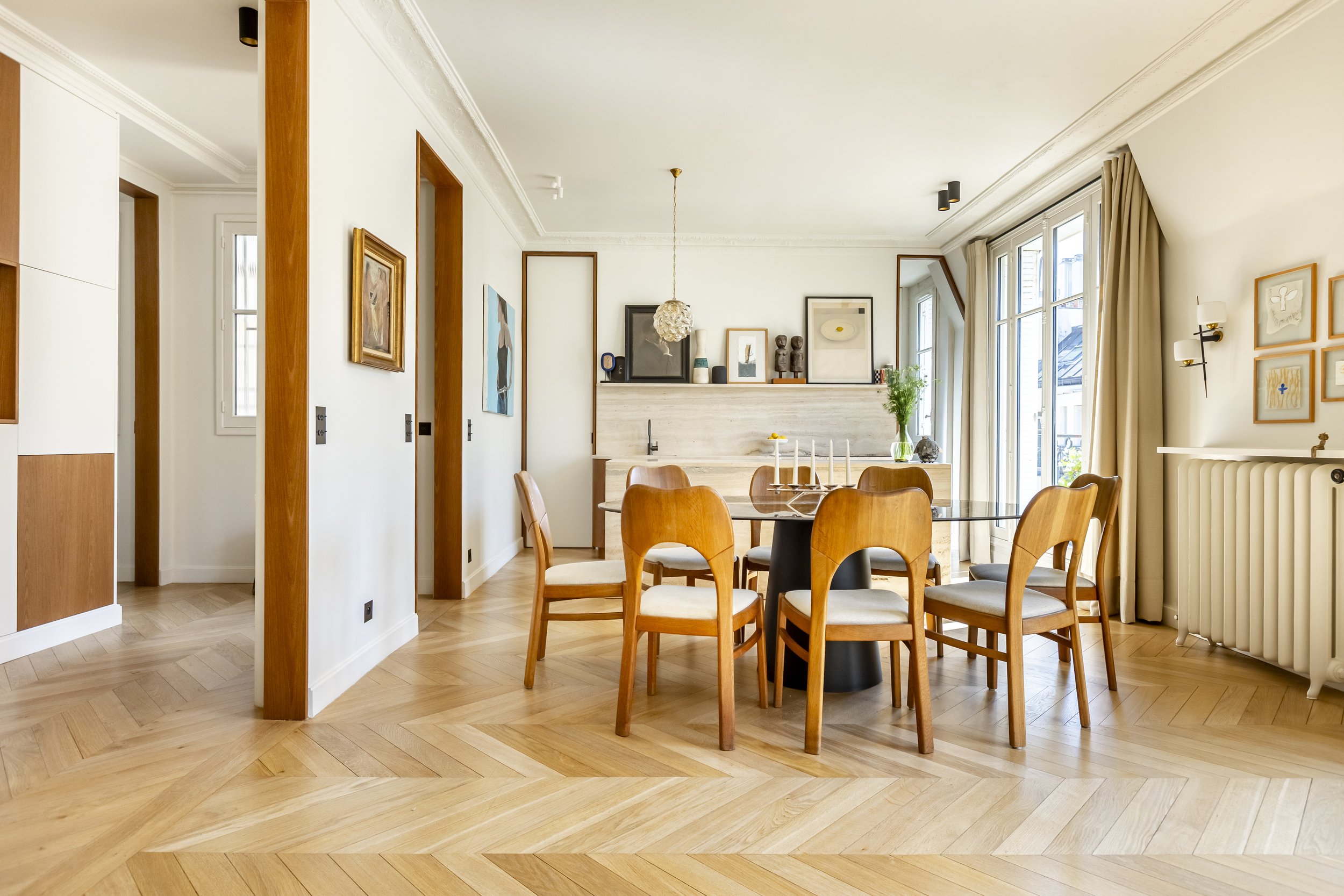 Le projet René Bazin s'inscrit dans la rénovation d'un appartement haussmannien parisien, mené en collaboration avec l’architecte Augustin Liagre et pensé dans un esprit contemporain et chaleureux. Les éléments classiques du lieu — parquet en point de Hongrie, moulures, cheminée, grandes fenêtres — dialoguent avec un mobilier sur mesure en bois, des matériaux naturels et une décoration éclectique d'inspiration design et artistique. Une intervention qui préserve l'âme du lieu tout en lui insufflant une sensibilité résolument actuelle.
