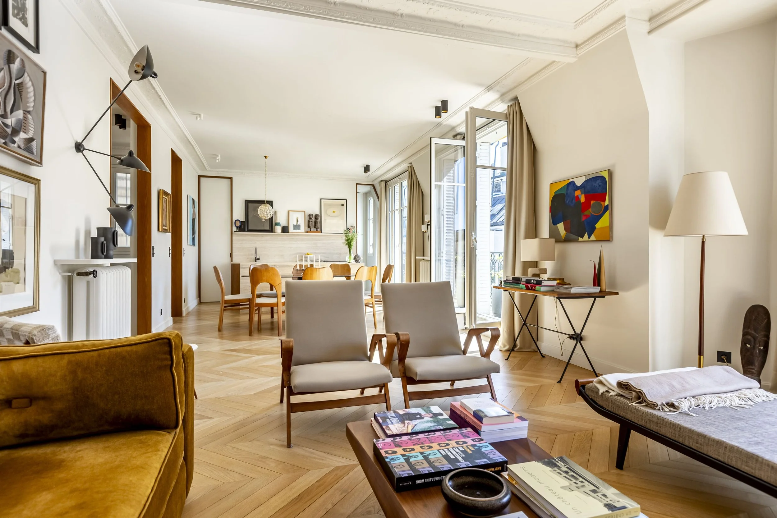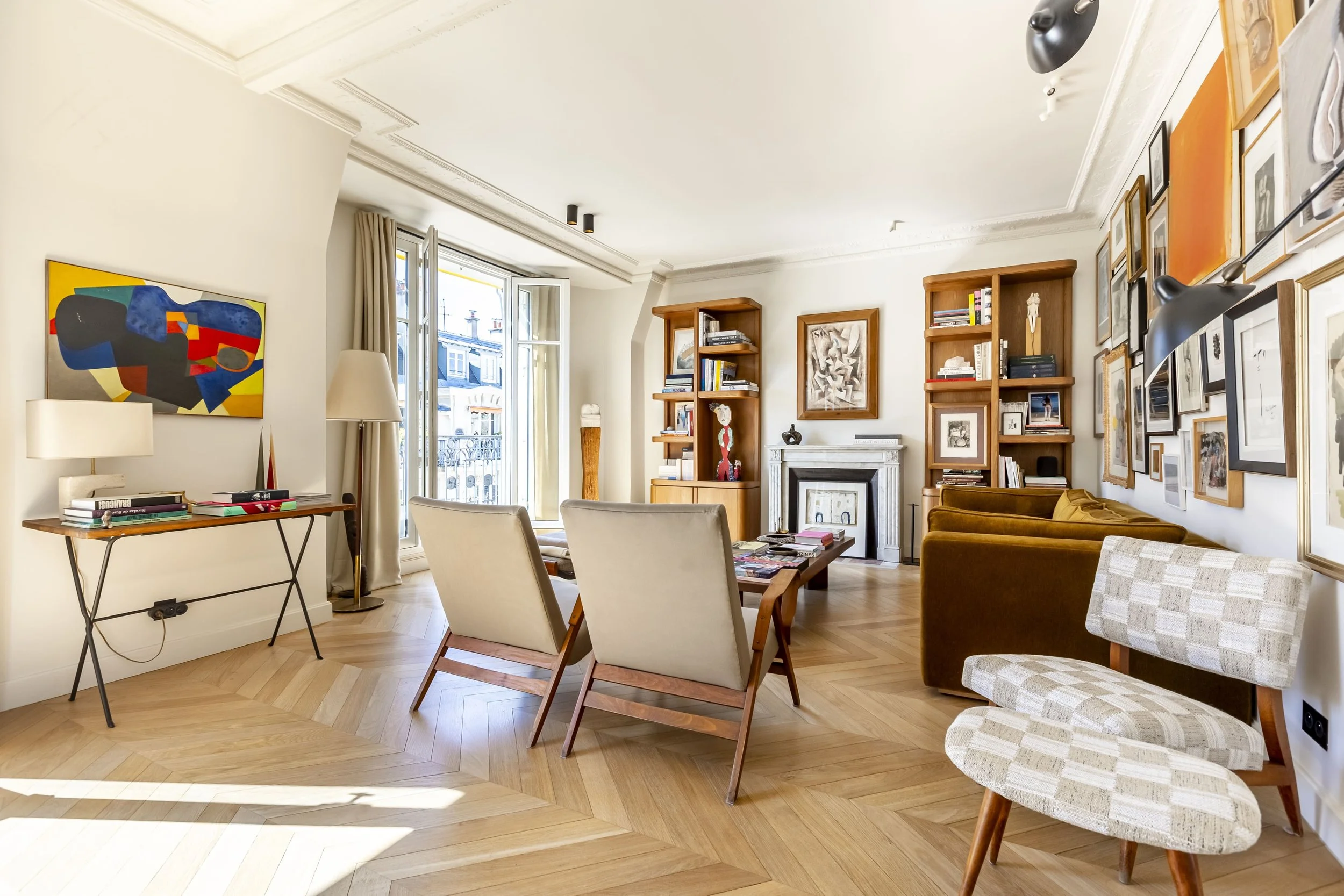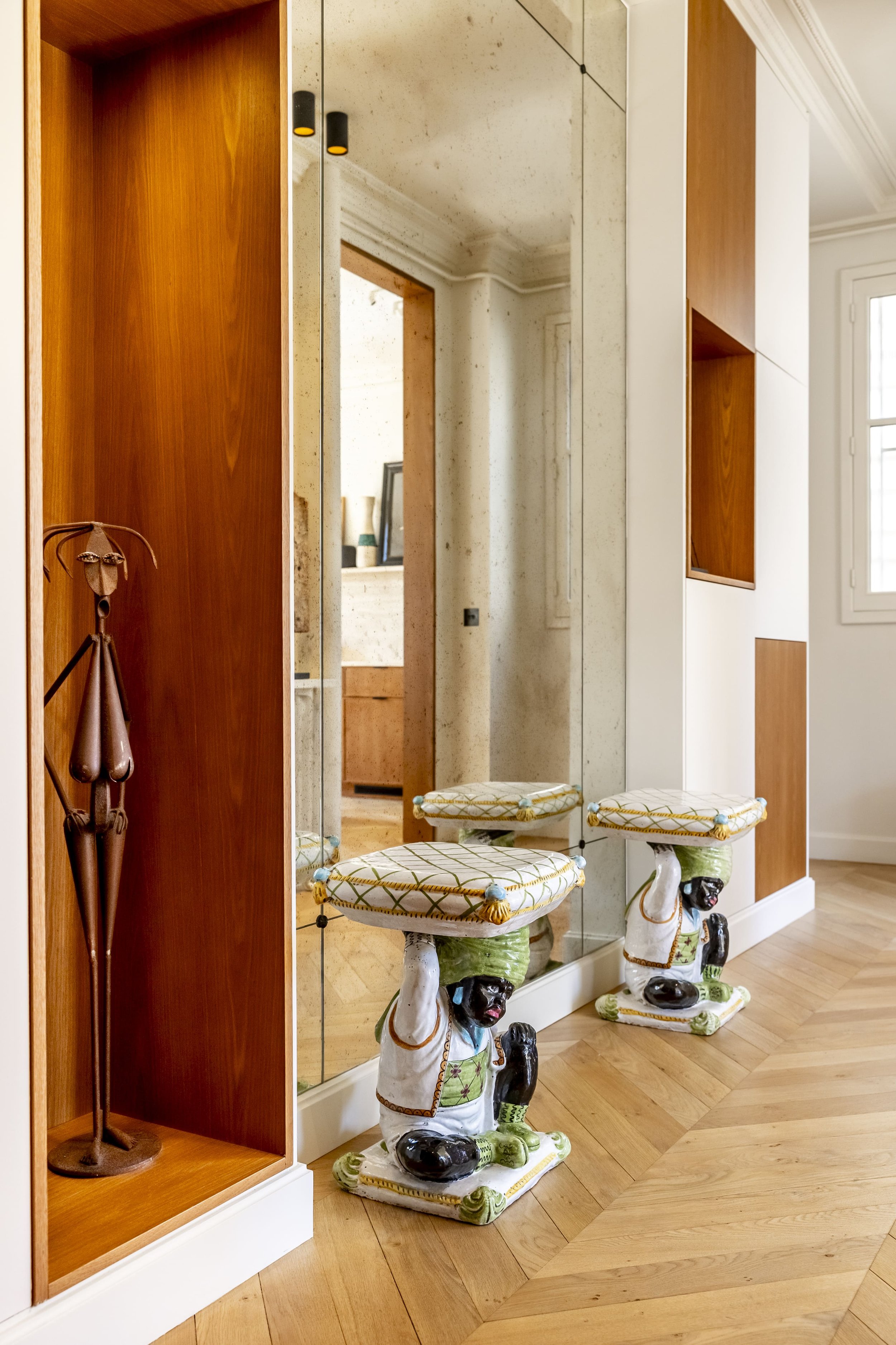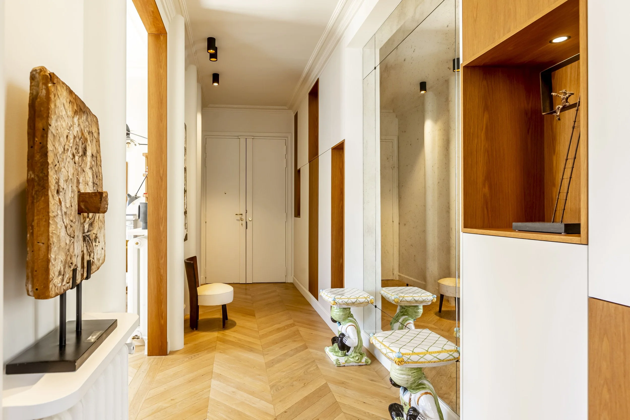 Le projet René Bazin s'inscrit dans la rénovation d'un appartement haussmannien parisien, mené en collaboration avec l’architecte Augustin Liagre et pensé dans un esprit contemporain et chaleureux. Les éléments classiques du lieu — parquet en point de Hongrie, moulures, cheminée, grandes fenêtres — dialoguent avec un mobilier sur mesure en bois, des matériaux naturels et une décoration éclectique d'inspiration design et artistique. Une intervention qui préserve l'âme du lieu tout en lui insufflant une sensibilité résolument actuelle.
